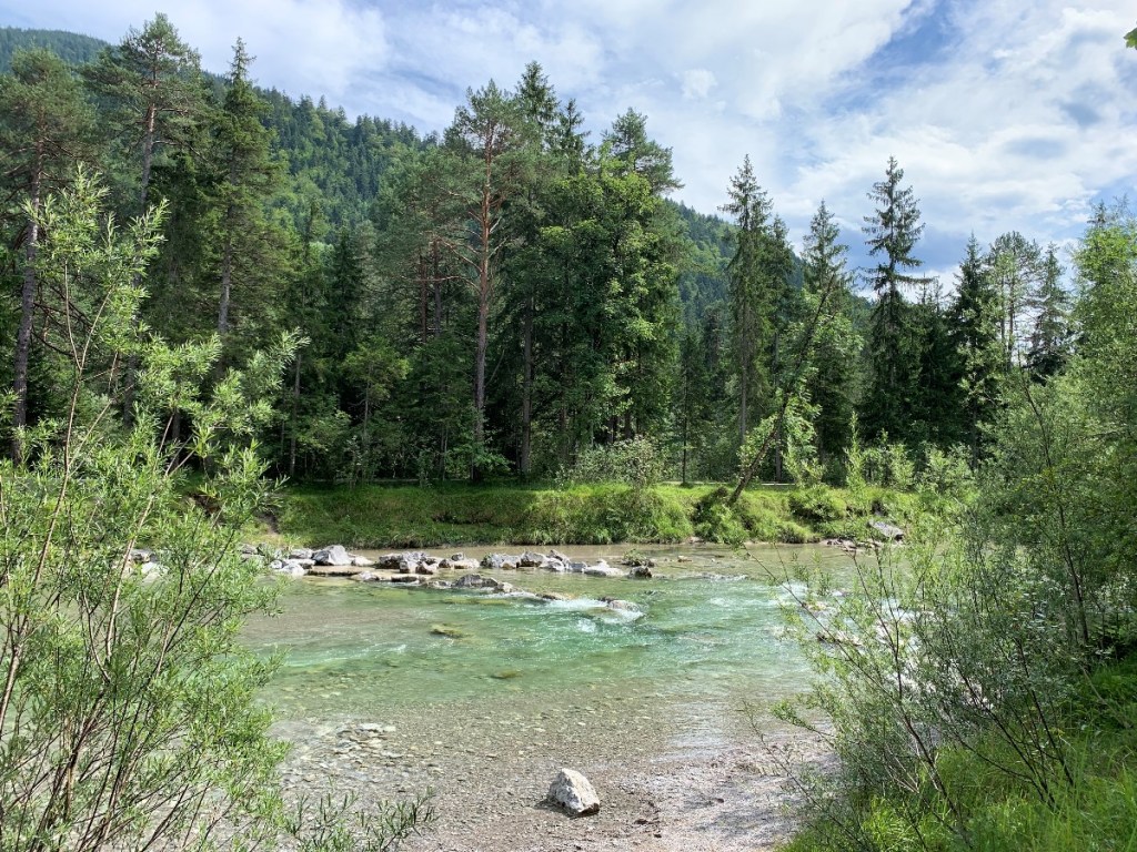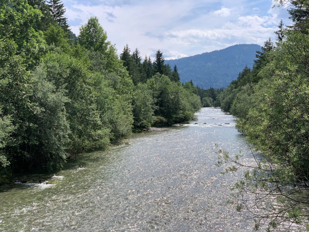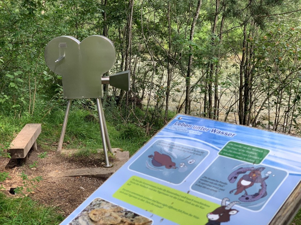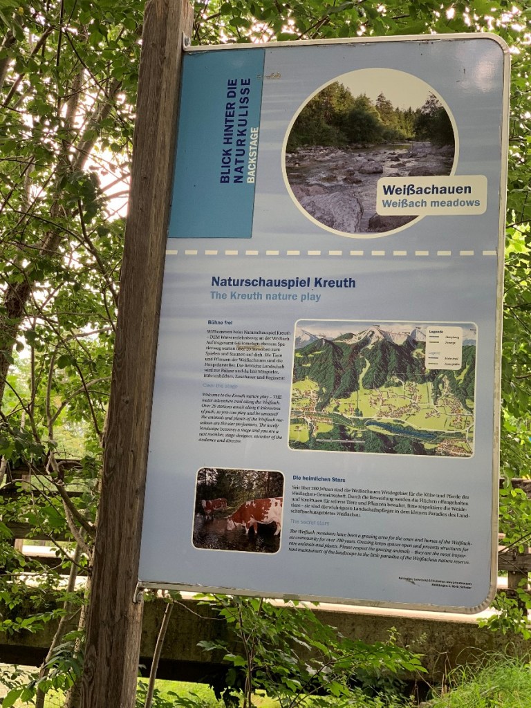 In der Nähe des Tegernsees bei Kreuth liegt die Weißach. Dort entlang geht ein einfacher Erlebnisweg mit 20 verschiedenen Stationen zum Erleben, Lernen und Ausprobieren. Theaterspielen kann man auch. Also ganz genau das, was mein Niveau an Wanderungen widerspiegelt und dort war ich an einem Samstag Nachmittag. Von München aus in einer guten Stunde erreichbar, also perfekt für einen kleinen Ausflug. Auf der Hälfte des Weges kann man an der Weißach Alm einkehren. Gut, dass ich es an dem Nachmittag nach kurzer Überlegung nicht gemacht habe, 10 Minuten nachdem ich im Auto war ging das Gewitter los.